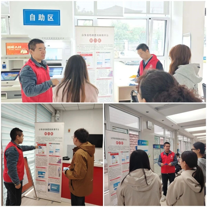 区档案馆精心印制一批宣传易拉宝和宣传手册,直观展示了平台的核心功能与使用步骤,对平台的注册方法、查档范围、操作流程及常见问题进行了全面解读,并将制作好的易拉宝和宣传手册投放至相关窗口单位,确保市民在办理相关业务时,能够第一时间看到、了解到“在鲁查档”平台,有效扩大平台的知晓度和影响力,将档案服务延伸至基层前沿。发放宣传资料的同时,区档案馆的工作人员还主动为现场前来咨询的市民进行面对面的讲解,耐心解答关于档案利用等方面的问题。