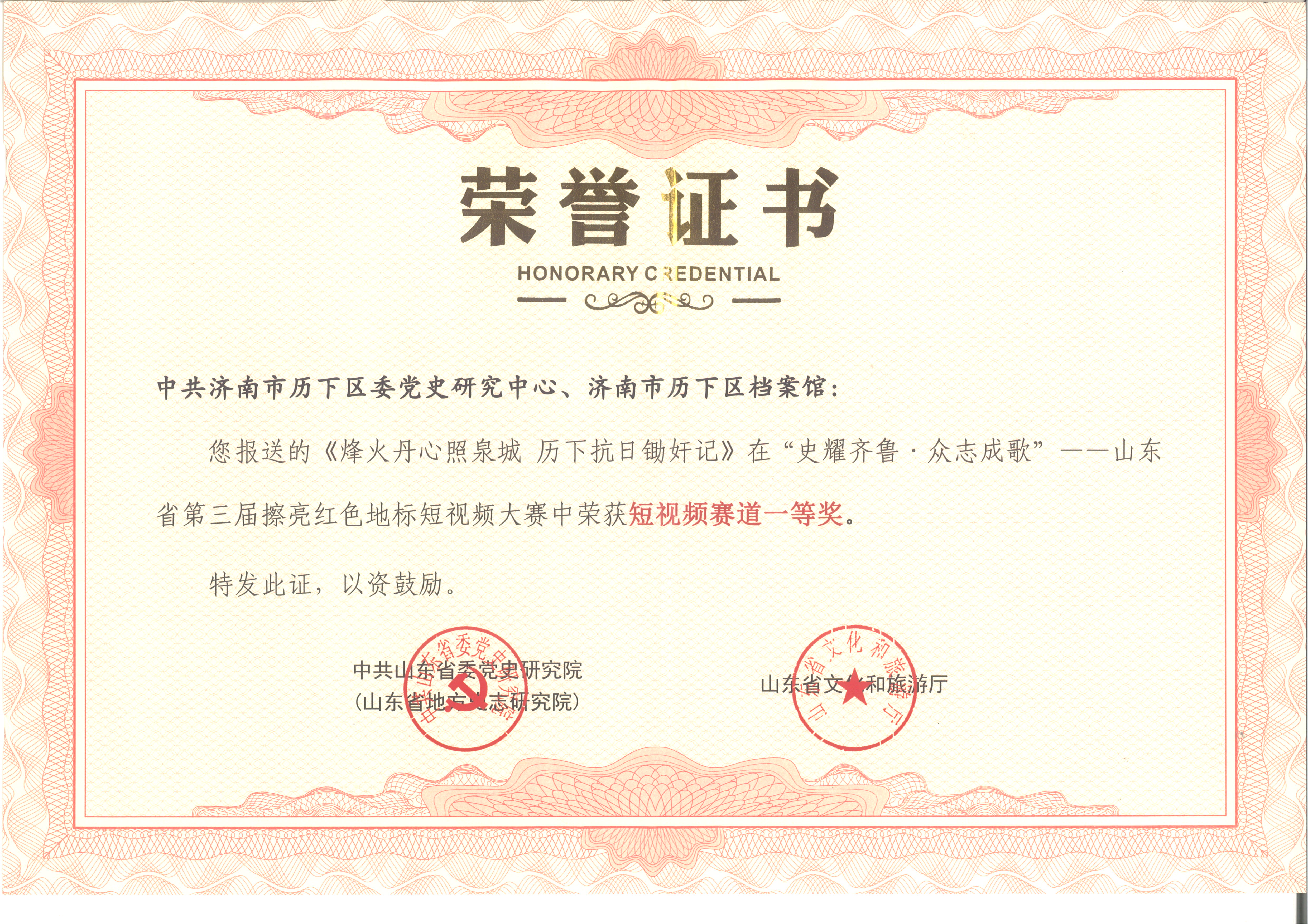 近日,由历下区档案馆精心打造的短视频《烽火丹心照泉城 历下抗日锄奸记》在“史耀齐鲁·众志成歌”——山东省第三届擦亮红色地标短视频大赛中脱颖而出,斩获一等奖殊荣。